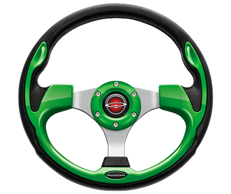 Add a splash of color and class to your golf car with a DoubleTake Lime Pilot steering wheel. Change out the inserts in the future to any one of 11 colors. Available for Club Car, E-Z-GO and Yamaha. It also comes complete with mounting hardware and car model specific adapter hub in choice of chrome or black finish.