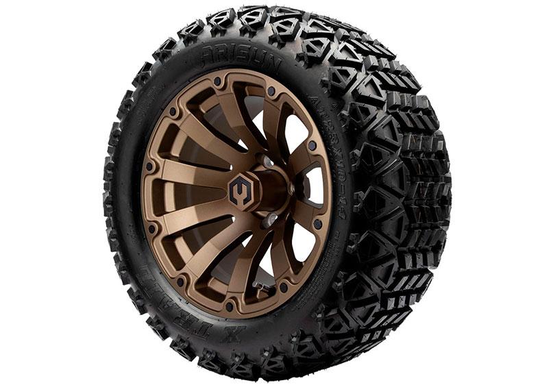 Matte bronze wheels on a golf car shouldn’t work this well, but here we are. The MODZ® Bomber combo delivers rugged personality without looking cartoonish. Designed specifically for lifted cars with a 6-inch lift or higher, this 14×7 setup uses an aggressive ET-25 offset for a planted stance. Multiple tire options let owners lean street, trail, or somewhere in between. Everything arrives mounted and ready, including center caps, with optional black lug nuts for a finished look. It’s a visual upgrade that also improves traction and ride confidence. Subtle flex, serious payoff.