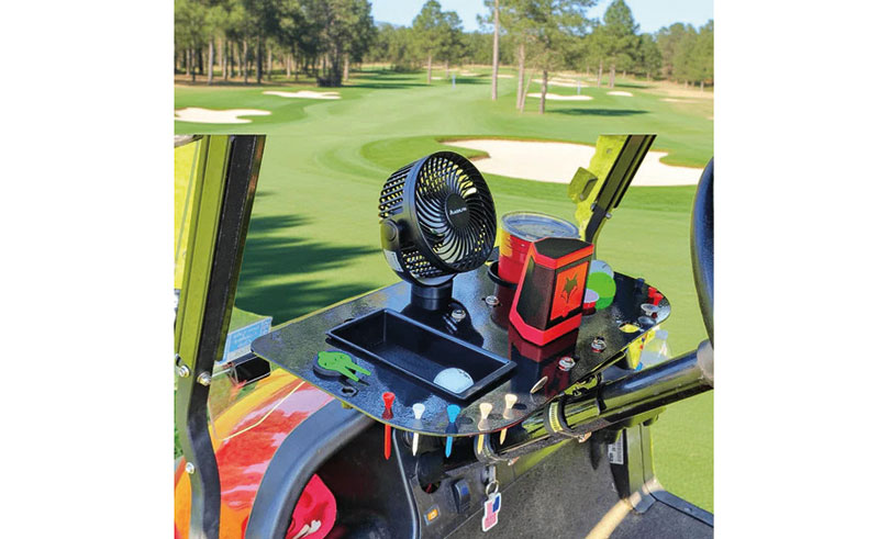 If your golf car dashboard situation feels improvised, this fixes that. CMBH’s steering column dashboard adds real storage and utility without drilling or permanent mods. Built from powder-coated steel, it clamps securely around the column and adjusts to fit almost any car. Ten tee holders, ball slots, bottle opener, recessed tray, magnet mount, and even a propane cup holder all live on one compact platform. It’s smart, overbuilt, and genuinely useful. Wallets stop sliding, speakers have a home, and everything stays within reach. Handmade in the USA, because of course it is.